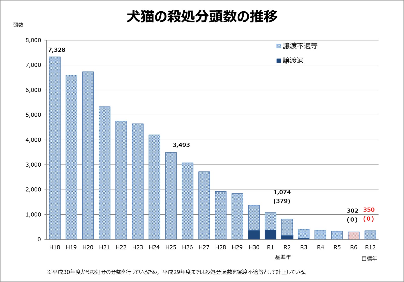 犬・猫の収容数が減るように,適正飼養の啓発の強化に努め,動物を飼養する際の飼い主責任について,県民の認識を深めるとともに,飼い主のいない猫を生み出さないための取組をさらに進めていきます。なお,R4年度以降,譲渡適性のある犬・猫の殺処分頭数は0となっています。