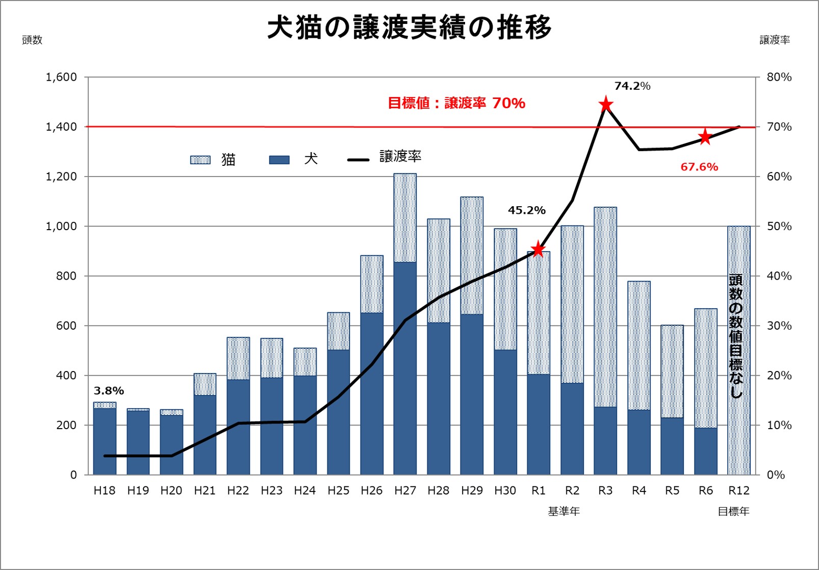 犬・猫の譲渡率は令和元年度実績より25%アップを,また,犬・猫の殺処分頭数についておおむね1/3を目指します。