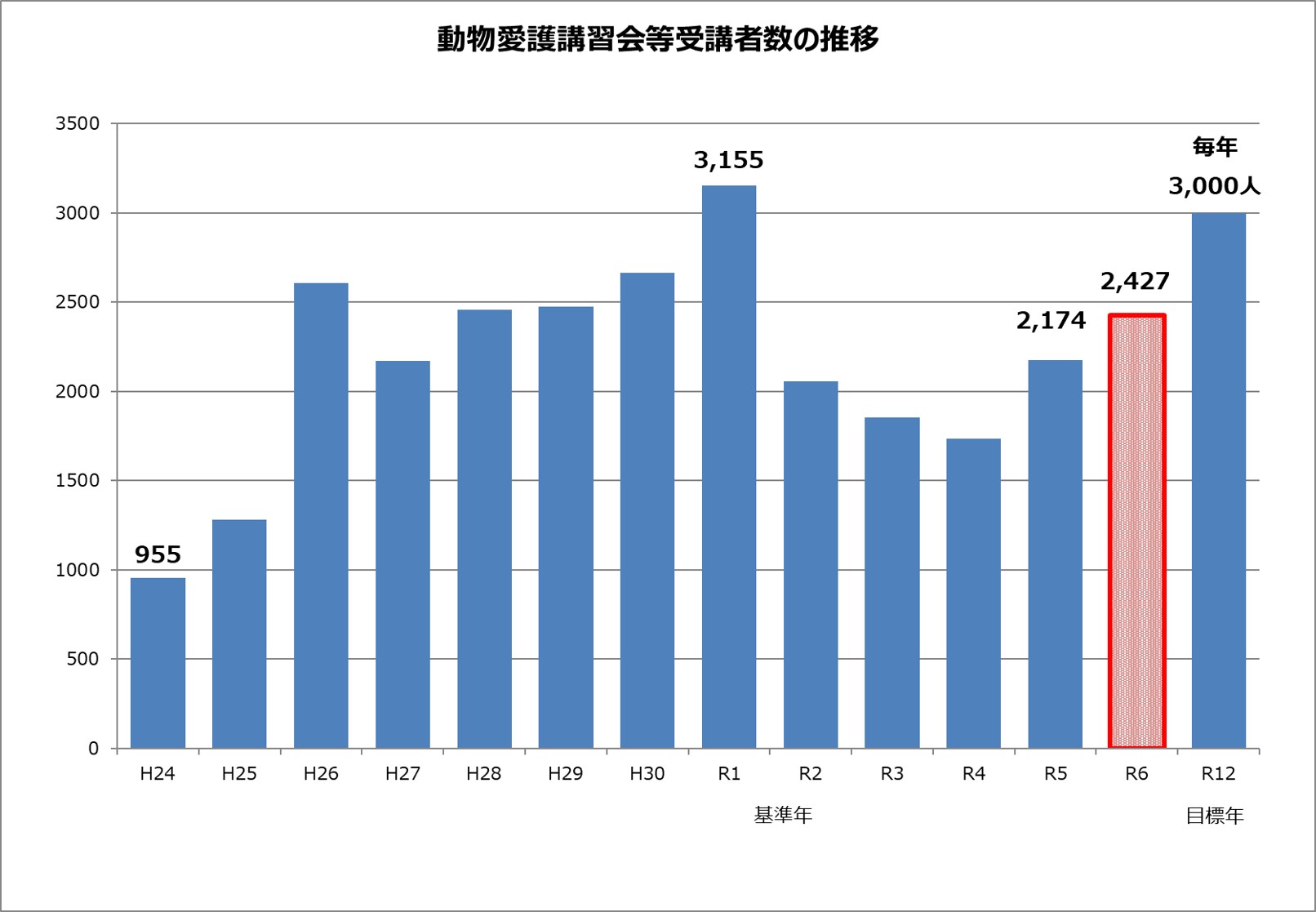 本県では,計画の柱となっている「動物愛護管理の基本的考え方」,「鹿児島県における動物愛護管理の現状」及び「講ずべき施策等」の3つの観点から,「犬・猫の譲渡率」,「犬・猫の殺処分頭数」,「動物愛護教室等の延べ参加者数」について,次に掲げる10年度の数値目標の達成を目指します。
