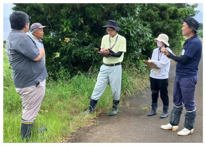 地域計画の重点支援地区に位置付けている長島町城川内地区で,ばれいしょ後作に牛糞堆肥を投入しソルゴーを栽培する耕畜連携モデル試験を実施しています。畜産農家には粗飼料確保と牛糞処理,耕種農家には地力向上と夏場の景観改善が期待できます。7月16日に現地検討会を行い,畜産農家と耕畜連携の現状と課題改善について意見交換しました。また,室内検討では課内の役割分担を行い,成果の波及までの方向性を共有しました。