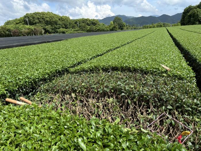 二番茶後の更新は,細くなった枝を切り落とす作業です。深刈り位置が低いほど,樹勢回復に優れますが,再生芽の充実に生育期間を要するため,二番茶摘採後,速やかに行うことが望ましいです。しかし,個人工場では,労力が不十分なため,二番茶の摘採,製造を全て終わらせた後,経営主自ら更新作業に入ることが多いです。今年は,一,二番茶期が遅れたことから,時期に応じた深刈り位置を事前に共有しました。経営主は,「納得のいく深刈りができた」と手応えを感じていました。