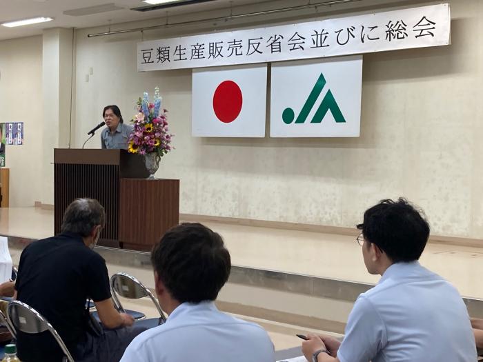 7月15日,JA鹿児島いずみ本所で,豆類部会の令和6年度総会と生産販売反省会が開催され,部会員,市場,関係者等134人が出席しました。2月の寒害の影響が大きく,豆類全体では,面積33ha(前年比87%),共販量322t(昨年比92%),共販額263百万円(前年比87%)と前年度を大きく下回りました。反省会では,品目毎の課題と対策の検討を行い,農政普及課からそらまめ「はるのそら」展示ほの実績と特性について説明しました。当課では,今後も「はるのそら」の推進と生産安定に向け支援します。