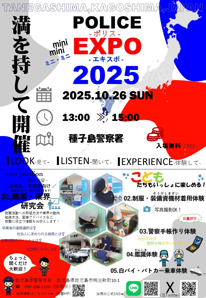 県警の概要 > お知らせ > 採用関係情報【試験・イベントなど】 > 採用イベント【説明会・オープンキャンパスなど】 > 【再開催決定!!】ポリスエキスポin種子島
